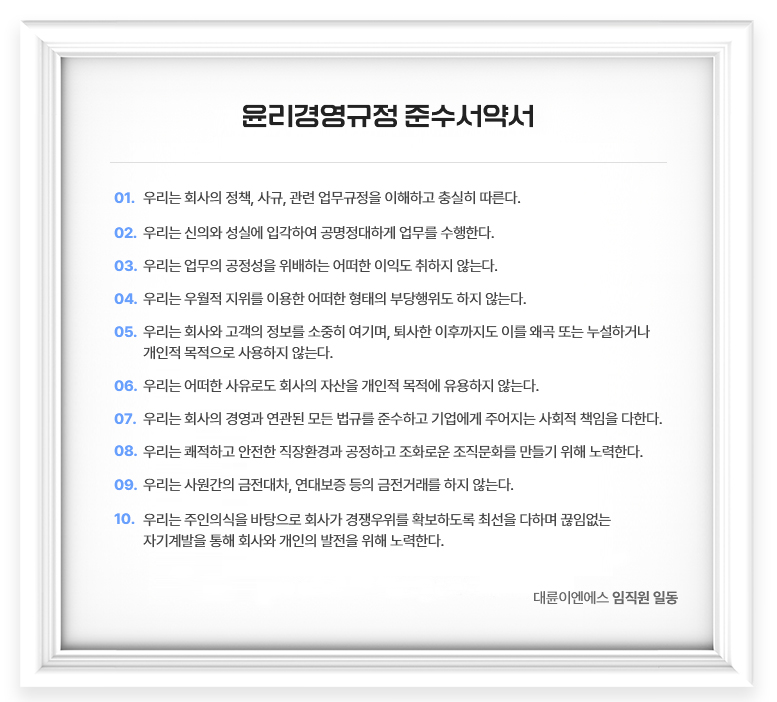전 임직원은 행동강령을 준수하겠다는 서약을 시행하고 있습니다.