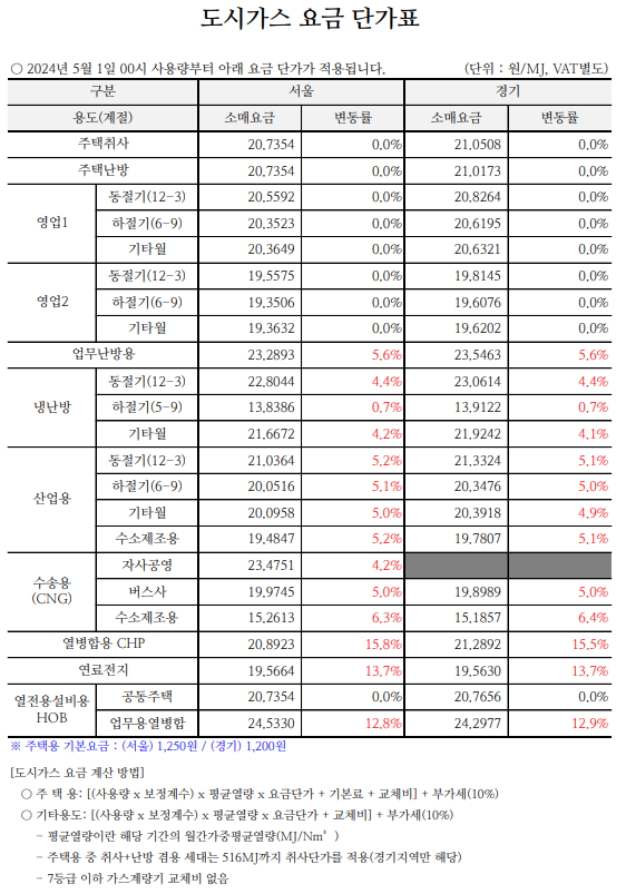 2024년 5월 1일 자로 도시가스 요금이 변동되었습니다.