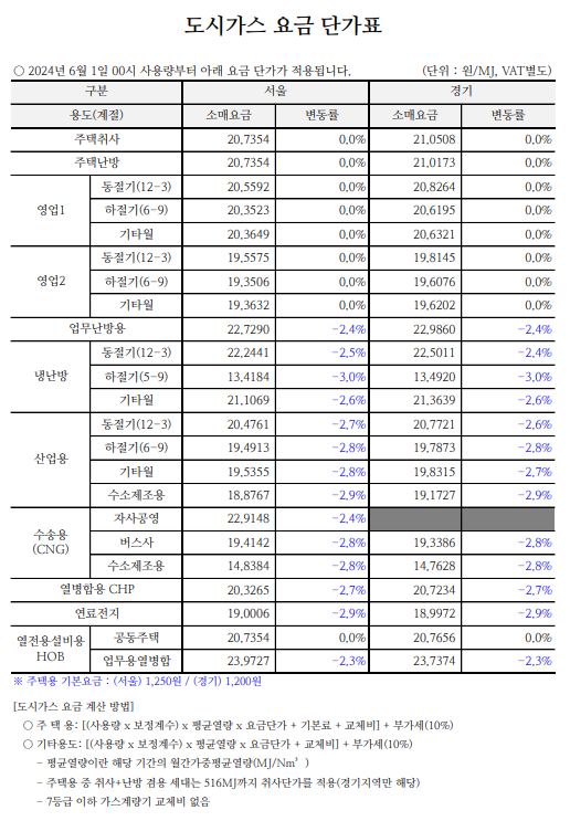 2024년 6월 1일 자로 도시가스 요금이 변동되었습니다.