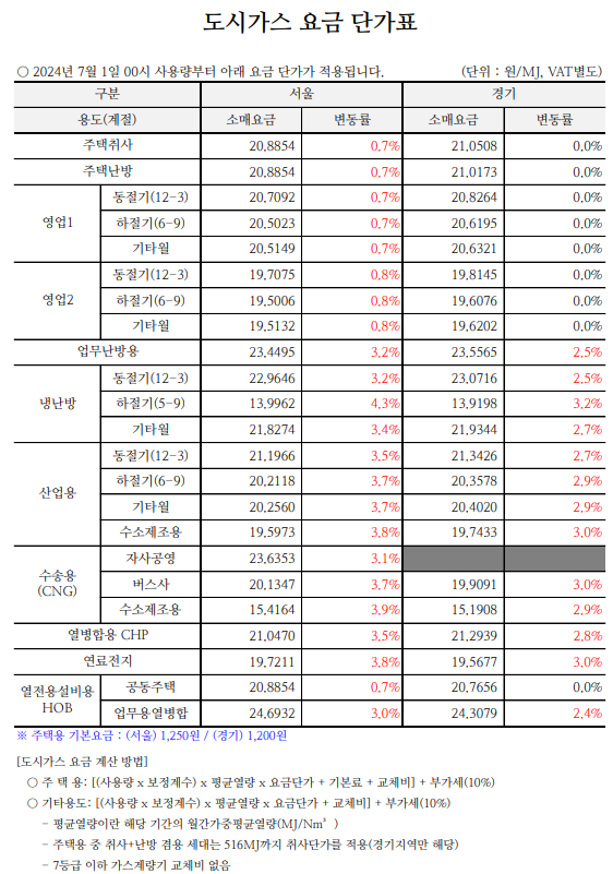2024년 7월 1일 자로 도시가스 요금이 변동되었습니다.