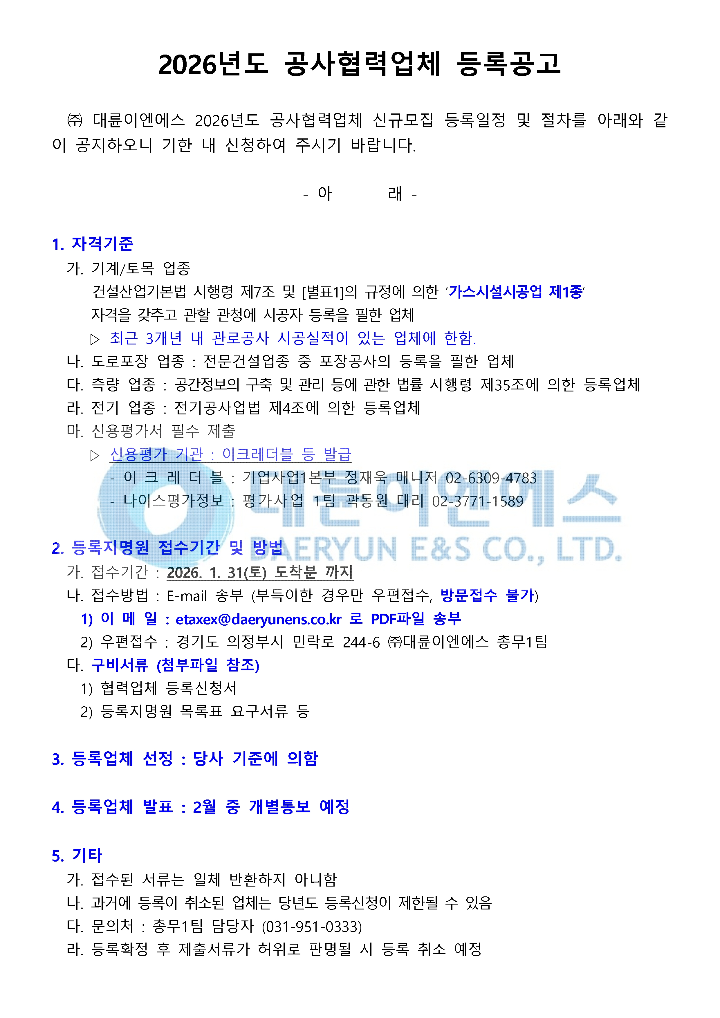 2026년도 공사협력업체 등록공고